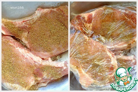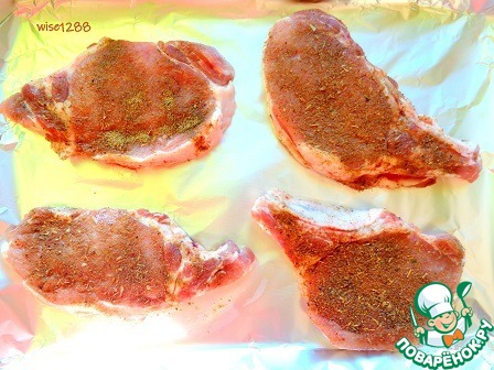 Свинину на косточке разделить на порционные кусочки, обвалять в специях, закрыть пищевой пленкой и оставить в таком виде, в прохладном месте, минимум на 40 минут. Мясо не солю, в готовых специях (как правило) есть соль. Время приготовления указано без учета маринования мяса в специях, т. к. этот процесс может проходить по разному, от 40 минут до 12 часов в зависимости от наличия у вас свободного времени.