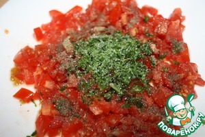 Нарезать мелко помидор и петрушку. Можно вместо петрушки взять укроп или кинзу.
