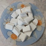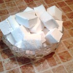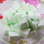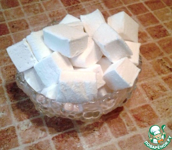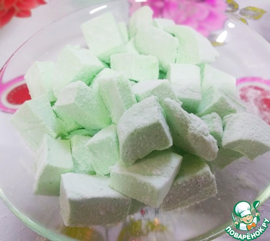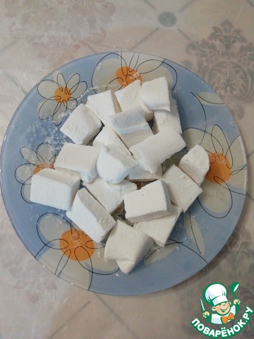 11. Смешиваем крахмал и сахарную пуду. Обваливаем квадратики маршмеллоу в крахмально-сахарной смеси и выкладываем на блюдо