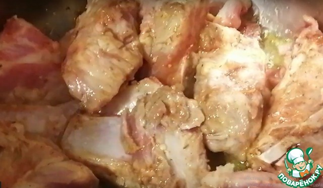Для начала займемся приготовлением маринада для ребрышек и самими ребрами. Необходимо помыть и разрезать ребра на небольшие кусочки. Специи, соль и сахар смешать и хорошенько натереть ребра. Оставить мариноваться на 30 минут.