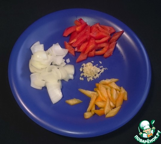 Перцы зачищаем от семян и белых перегородок. Нарезаем перцы ромбиком.