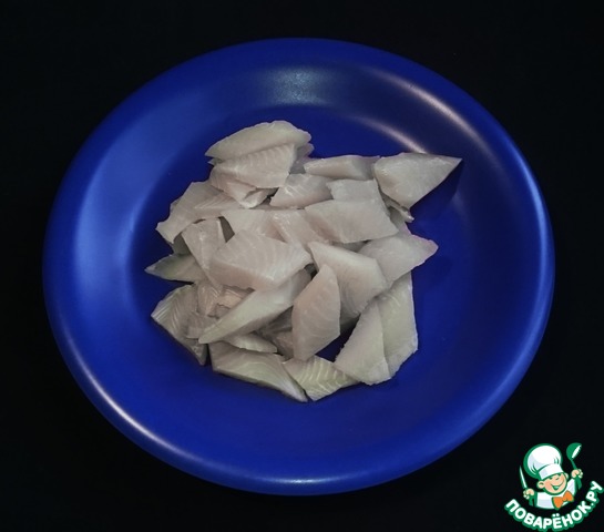 Нарезаем филе небольшим кубиком. Примерно 3х3х3 см. не больше. -