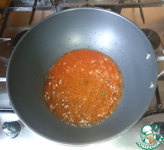 В чистый вок добавляем немного масла, выливаем приготовленный соус, прогреваем его и даём немного загустеть.