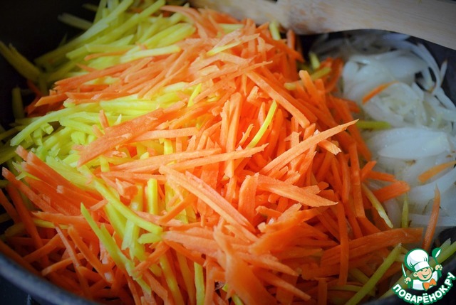 добавить соломку моркови, обжарить на среднем огне, 5 минут, помешивая.