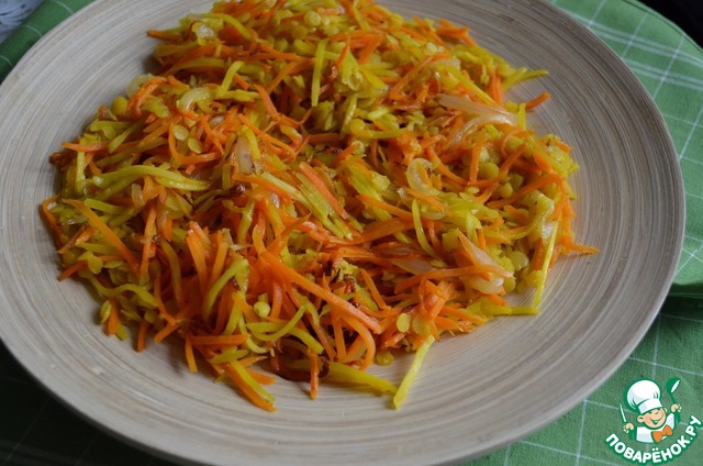 Морковно-луковую смесь смешать с горячей чечевицей,