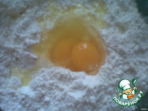 В муку разбиваю 2 яйца, перемешиваю, добавляю понемногу бульон и быстро замешиваю тесто. Получается эластичное пресное тесто.