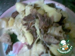 Достаем их. Кладем в большое плоское блюдо, сверху картошку, мясо, поливаем бульоном с луком и сверху нарезанное казы!!!