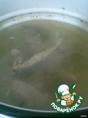 лук режу тонкими полукольцами, заливаю верхними слоями бульона, перчу и оставляю -