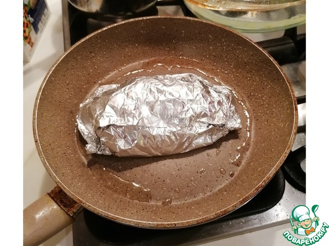 Нагреваем сковородку, наливаем немного любого масла для жарки (это позволит более равномерно распределяться теплу), кладём получившийся свёрток. Убедитесь, что маслом смазана вся поверхность фольги, которая соприкасается с поверхностью сковороды. Для этого можно просто "повозить" свёртком по сковородке.