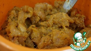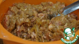 Первая часть фарша у меня из куриного филе. Филе режу небольшими кусочками, добавляю приправы. Все тщательно перемешиваю и отправляю на ночь в холодильник для вызревания. Перечно-ореховая приправа у меня своя, рецепт тут - https://www.povareno k.ru/recipes/show/15 9897/. И совет: куркума бывает не очень яркого цвета, тогда добавляйте больше, чтобы фарш стал желтеньким.