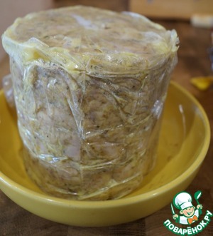 Сразу скажу, что формировать ветчину я буду в ветчиннице. Если ветчинницы нет, можно использовать пакет тетрапак от молока, в который так же кладется пакет для запекания. Или просто сложить фарш в пакет для запекания, слотно скрутить колбаской, сверху - еще пакет и обернуть туго пищевой пленкой.