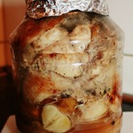 Положить в сухую литровую банку. Больше ничего добавлять не надо, прикрываем банку металлической крышкой (резинку вынуть!) и ставим в холодную духовку. Включаем средний огонь, минут через 20 убавляем огонь до минимума и оставляем ещё на 1 час томиться.