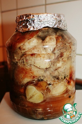 Кстати, чтобы сделать тушенку, курочку надо нарезать помельче и немного побольше посолить. В литровую банку помещается два окорочка.