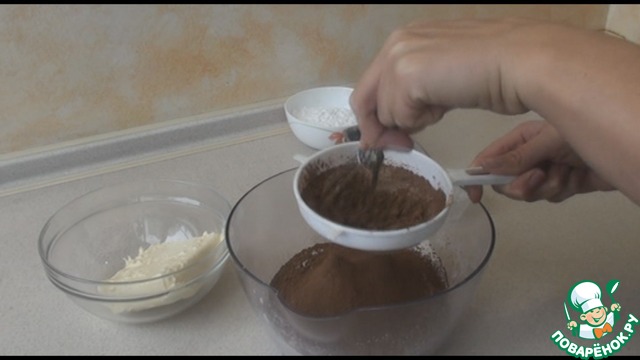 Подготовим сухие ингредиенты: просеем муку, крахмал, какао и разрыхлитель. Добавим соль, всё перемешаем.