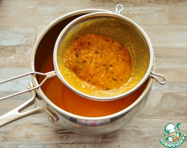 Чтобы избавиться от косточек облепихи и от грубых волокон кураги, протрите всё через сито.