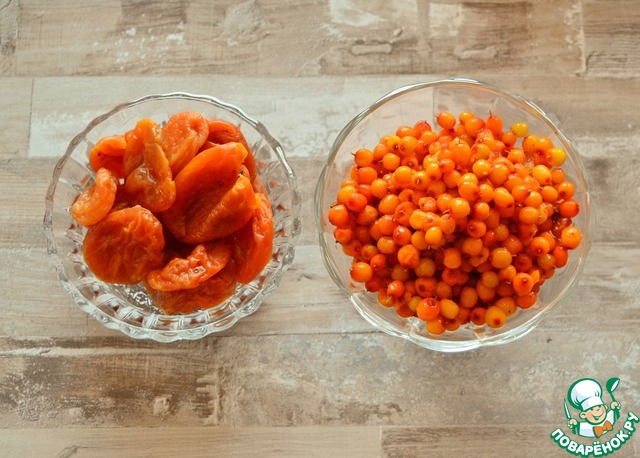 Залейте курагу и облепиху водой, поставьте на плиту, доведите до кипения, убавьте огонь, проварите 5 минут. Выключите плиту и оставьте до полного остывания. После того как отвар остынет, оставьте его настаиваться при комнатной температуре на 10-12 часов (например, на ночь)