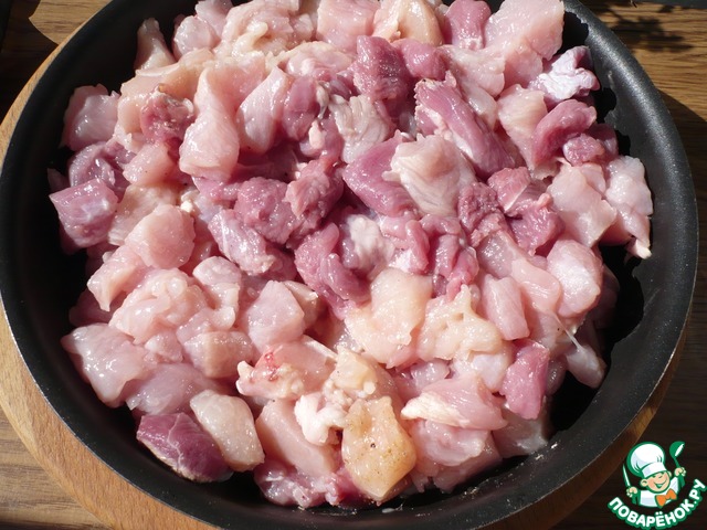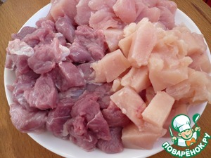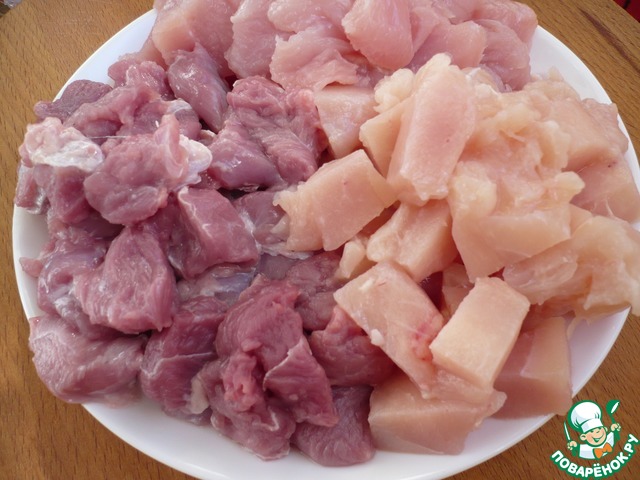 1. Нарезаем куриное филе, филе грудки индейки и филе бедра индейки кубиком. Мясо кладем в миску. Добавляем соль и белый перец по вкусу. Перемешиваем.