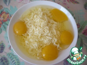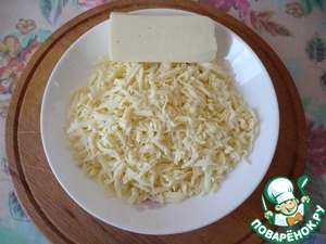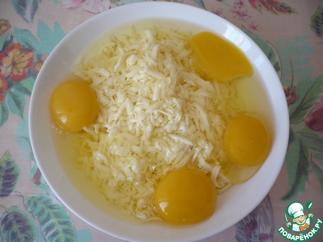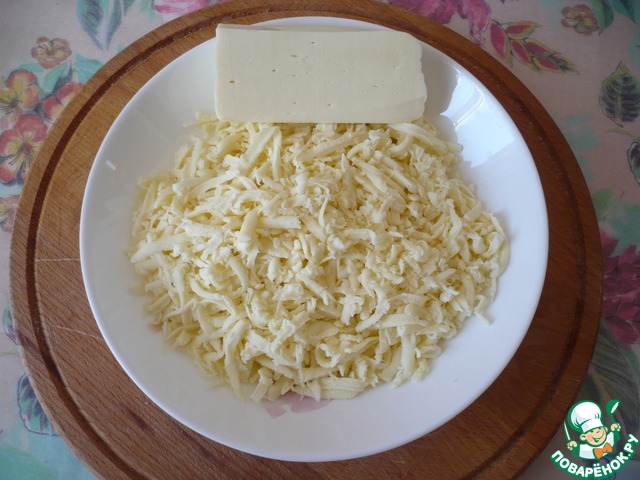 4. Теперь готовим сырную начинку. Натираем сыр сулугуни на крупной терке. Откладываем небольшую часть сыра (он будет нужен для посыпки пирога). Остальной сыр кладем в миску.