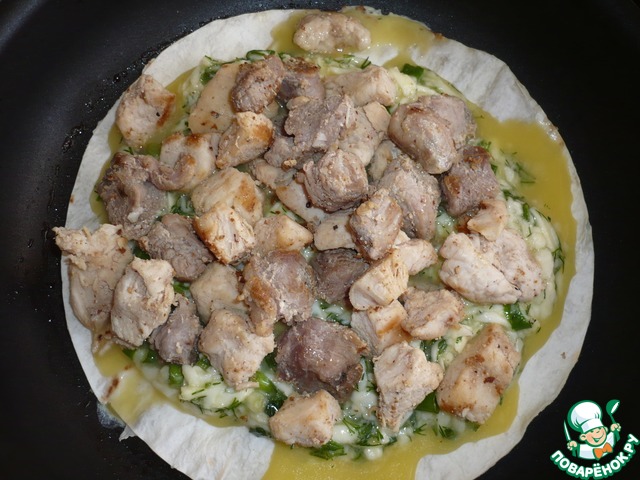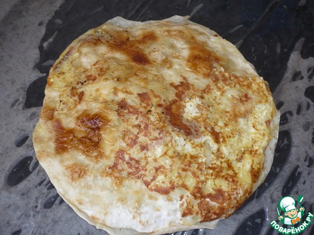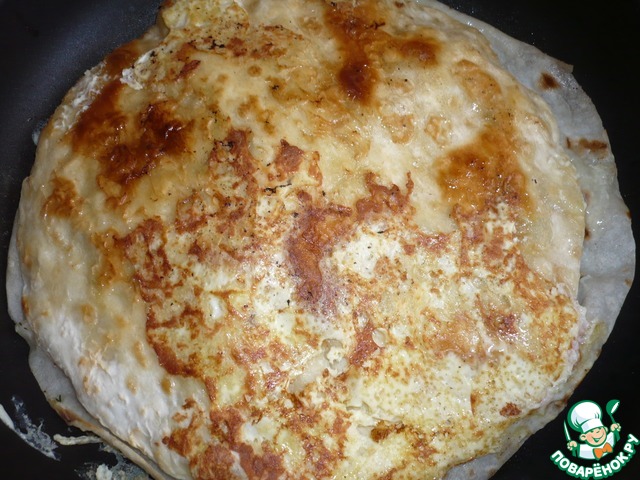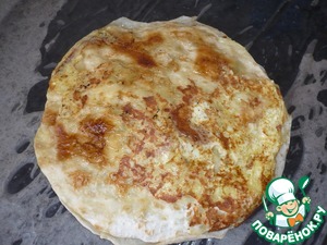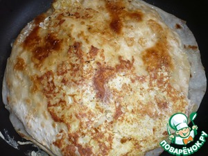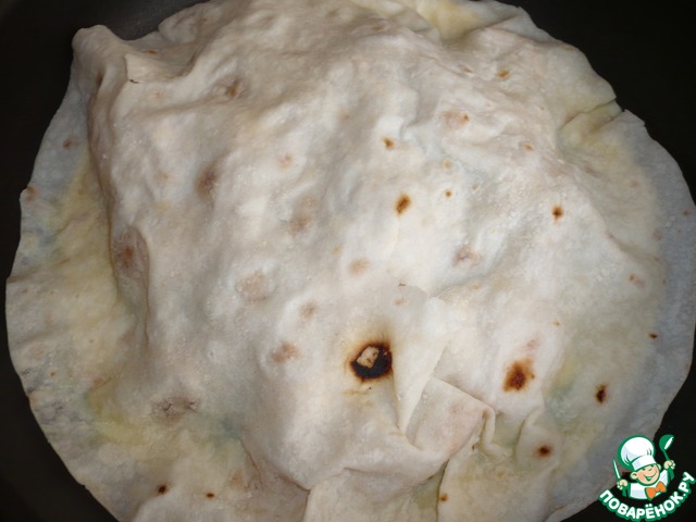 13. Когда нижний лаваш подрумянится, переворачиваем. Повторяем тоже самое с лавашом на другой сковороде.