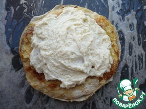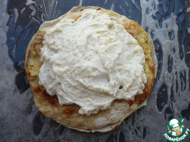 12. Затем снова кладем сырную начинку. Накрываем сверху мокрым лавашом.