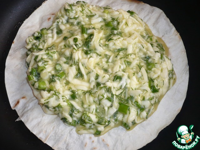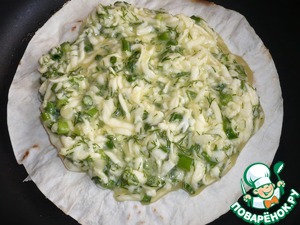 10. Разогреваем две сковороды и добавлением сливочное масло. Убавляем огонь. Смачиваем круги лаваша в холодной воде. Кладем в сковороды по листу лаваша. Лаваш обжариваем с одной стороны до золотистой корочки, а затем выкладываем сырную начинку на середину листа лаваша. Распределяем по поверхности, оставляя свободные края.