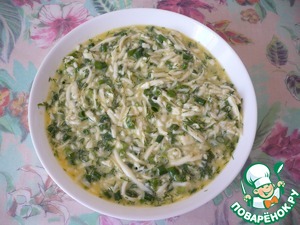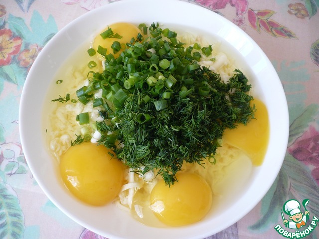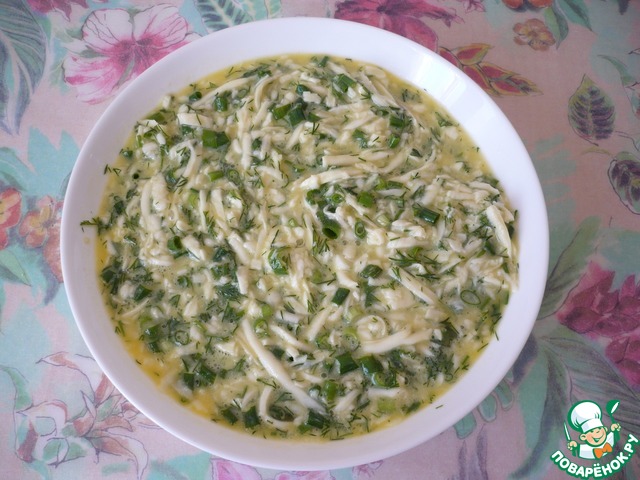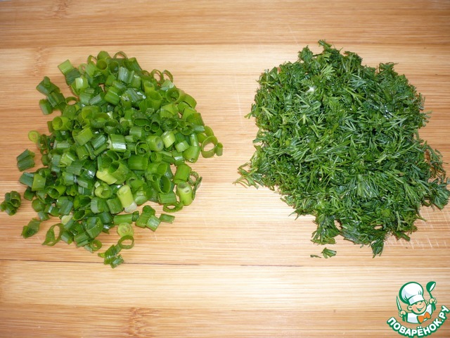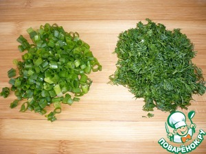7. Добавляем зелень в сыр. Перемешиваем до однородности.