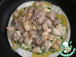 21. Закрываем вторым лавашом с начинкой и опять смазываем соусом. Посыпаем отложенным сыром сулугуни. Ставим в духовку на 8 минут при температуре 200 градусов.