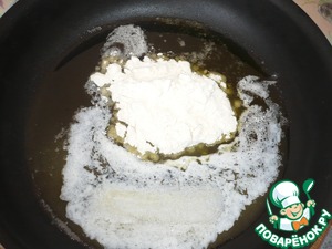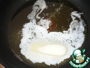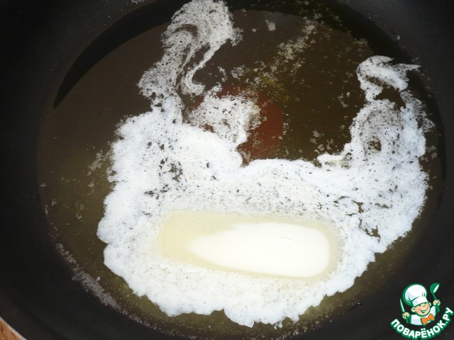14. Приготовим соус "аля бешамель". Разогреваем сковороду добавляем три вида масел: оливковое, подсолнечное и сливочное.