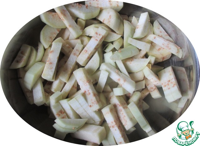 Баклажаны вымыть, очистить и нарезать брусочками или толстой соломкой, сложить в миску