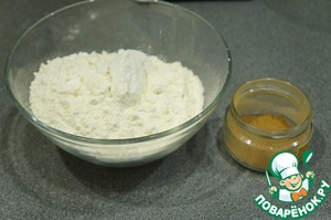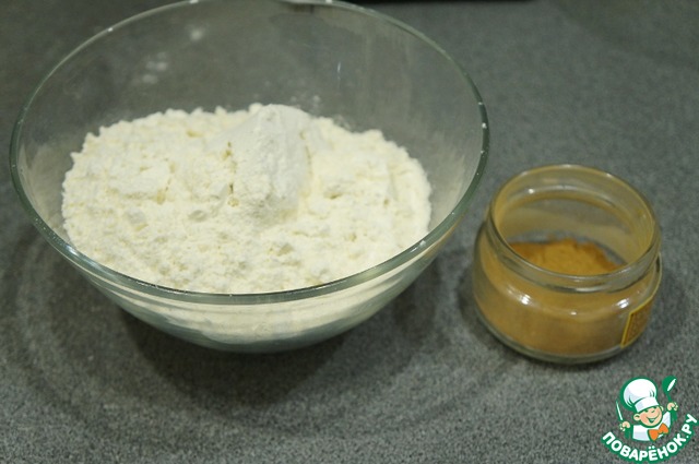 Муку, соду, разрыхлитель, соль и пряности просеять. -