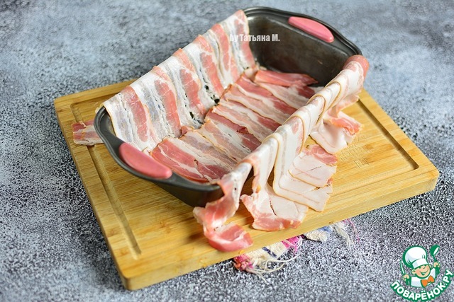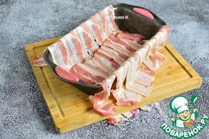 Подходящую форму обложить беконом так, чтобы края свисали.