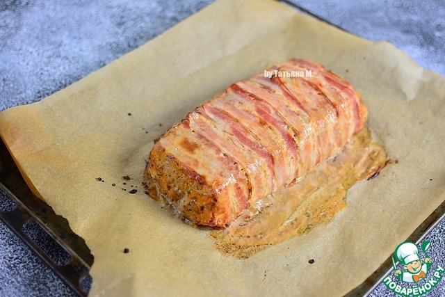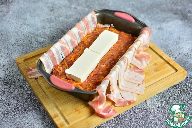Выложить оставшийся фарш плотно, разровнять и закрыть свисающим беконом.