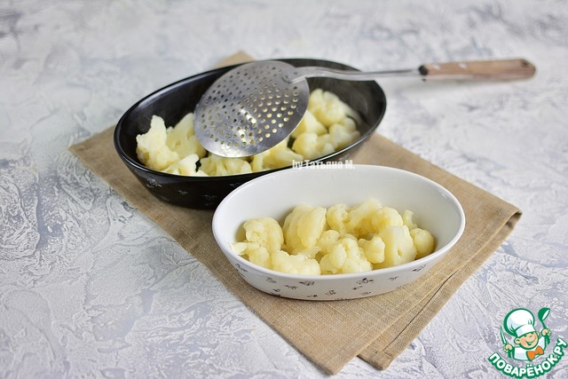 Цветную капусту разделить на соцветия и отварить в подсоленной воде 10 минут. Шумовкой вынуть капусту в форму для запекания.