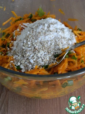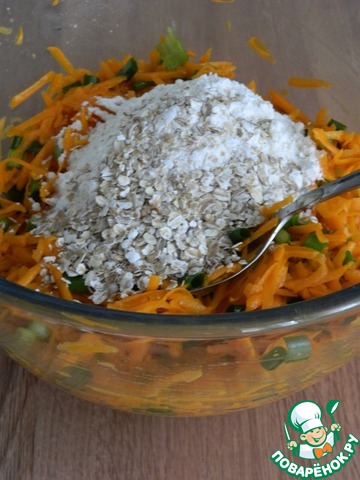 В овощную смесь выльем белки, добавим муку, овсяные хлопья, 1 ст. л. оливкового масла.
