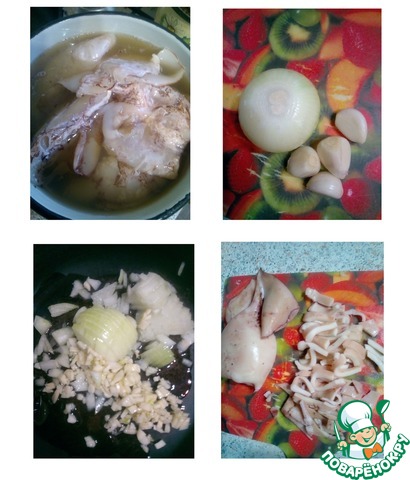 Берем тушки кальмаров и отвариваем - кипятим 5 мин. Сливаем, промываем и чистим по струей холодной воды. Пока кальмары варятся мелко режем лук и чеснок и ставим обжариваться на постном масле на медленном огне (не до золотистого цвета, а просто притушиваем) Кальмары почистили, режем на 4 части, а потом полосками.
