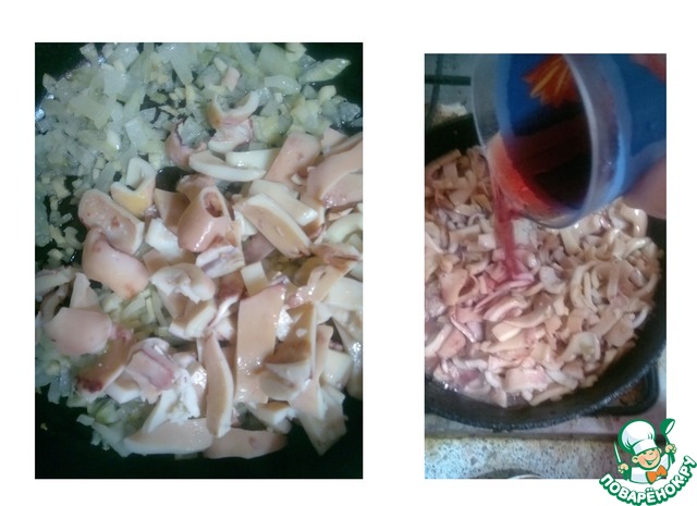 Кальмары выкладываем на сковороду к луку с чесноком и немного притушиваем - буквально 5 мин. Затеем вливаем 300мл. сухого красного вина и продолжаем тушить до почти полного выпаривания вина.