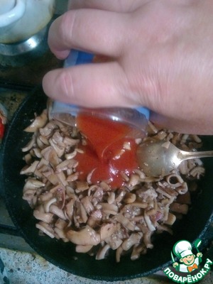 Разводим 2ст. л. томатной пасты в 1/2 ст. воды и вливаем в кальмары. Солим, добавляем сахар по вкусу (сахар добавлять однозначно, даже если не любите, чуть подсластить нужно) если вино было не сильно кислым, подкислить лимонкой. Тушим 5 минут.