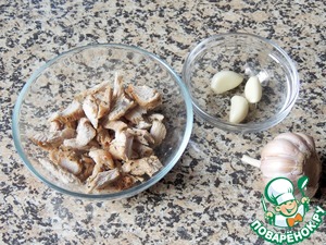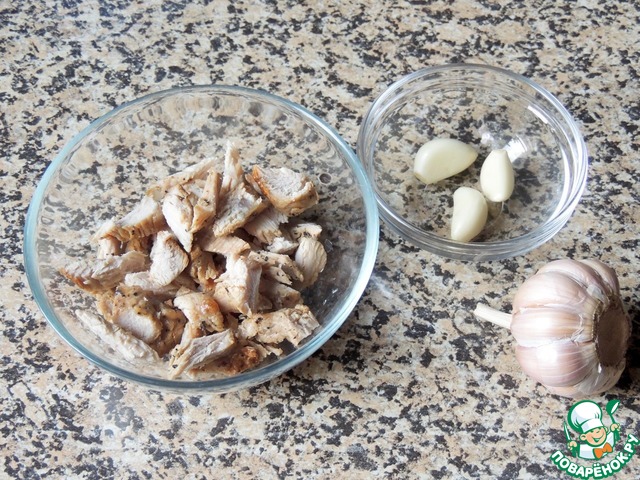 Мясо порезать небольшими кусочками. Это может быть запеченная или отварная курица, остатки шашлыка. Чеснок измельчить.