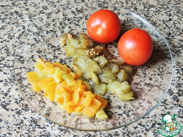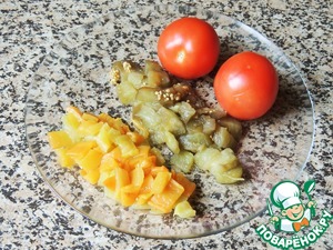 Охлажденные перцы и баклажаны очистить от кожицы, порезать небольшими кусочками. Помидоры нарезать дольками, зелень измельчить.