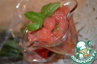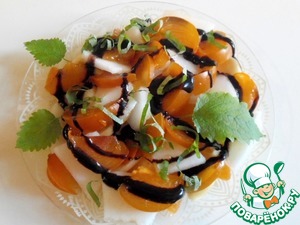 Посыпать салат зеленью мяты и заправить шоколадным топпингом (можно приготовить шоколадный соус самостоятельно).