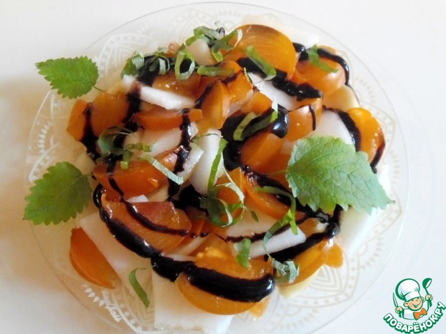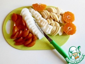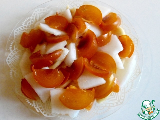 Хурму помыть, обсушить. Аккуратно разрезать на 4 части вдоль. Удалить косточки и нарезать на пластины. Также нарезать яблоки и дыню.