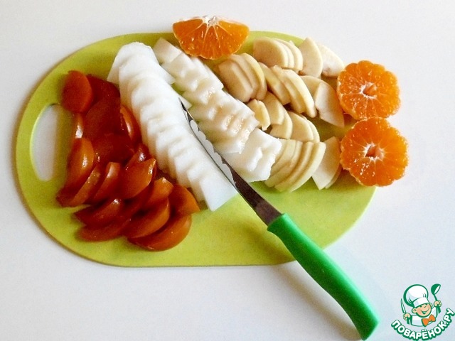 Дыню, мандарины и яблоко помыть, очистить от кожицы и семян.
