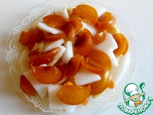 На тарелку выкладываем пластины яблок. Сверху дольки мандаринов.