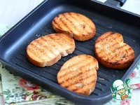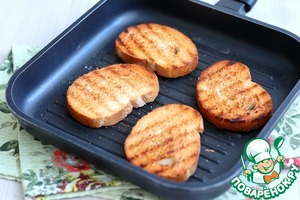 Ломтики батона обжарить в тостере или на сухой гриль-сковороде до красивой румяной корочки.