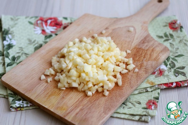 Яблоко (1 шт.) почитить, удалить сердцевину, нарезать мелкими кубиками, затем сбрызнуть лимонным соком во избежание потемнения.