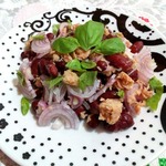 Выложить фасоль на тарелку, полить половиной заправки вместе с луком и чесноком.