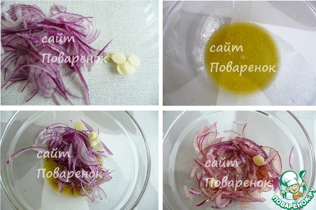 Для заправки смешать оливковое масло, уксус, соль, перец.
