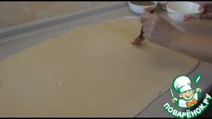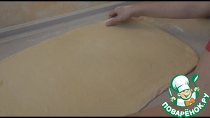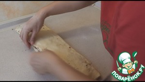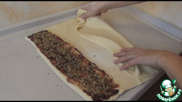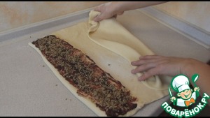 Потом аккуратно заворачиваем тесто, накрывая смазанное. Расправим и немного прижмем руками.