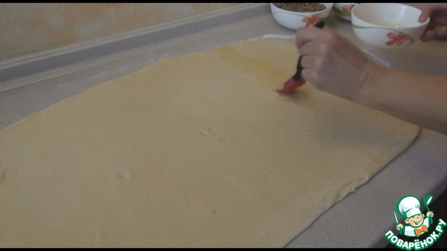 Опять смазываем маслом, джемом и теперь орехами. У нас получается наподобие гармошки. И снова накрываем тестом, распределяем и прижимаем руками.