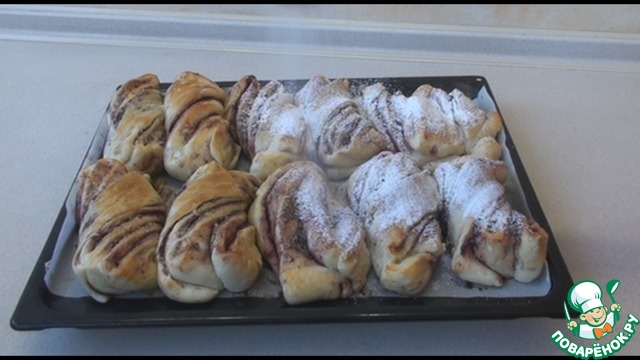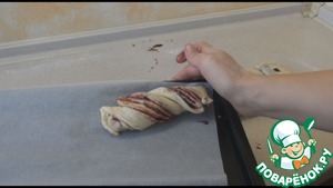 Берем разрезанную полоску и скрутим её жгутиком. Выкладываем на противень, застеленный пергаментной бумагой. Аналогично крутим все булочки. Оставляем булочки на 5 минут, чтобы они немного подошли.